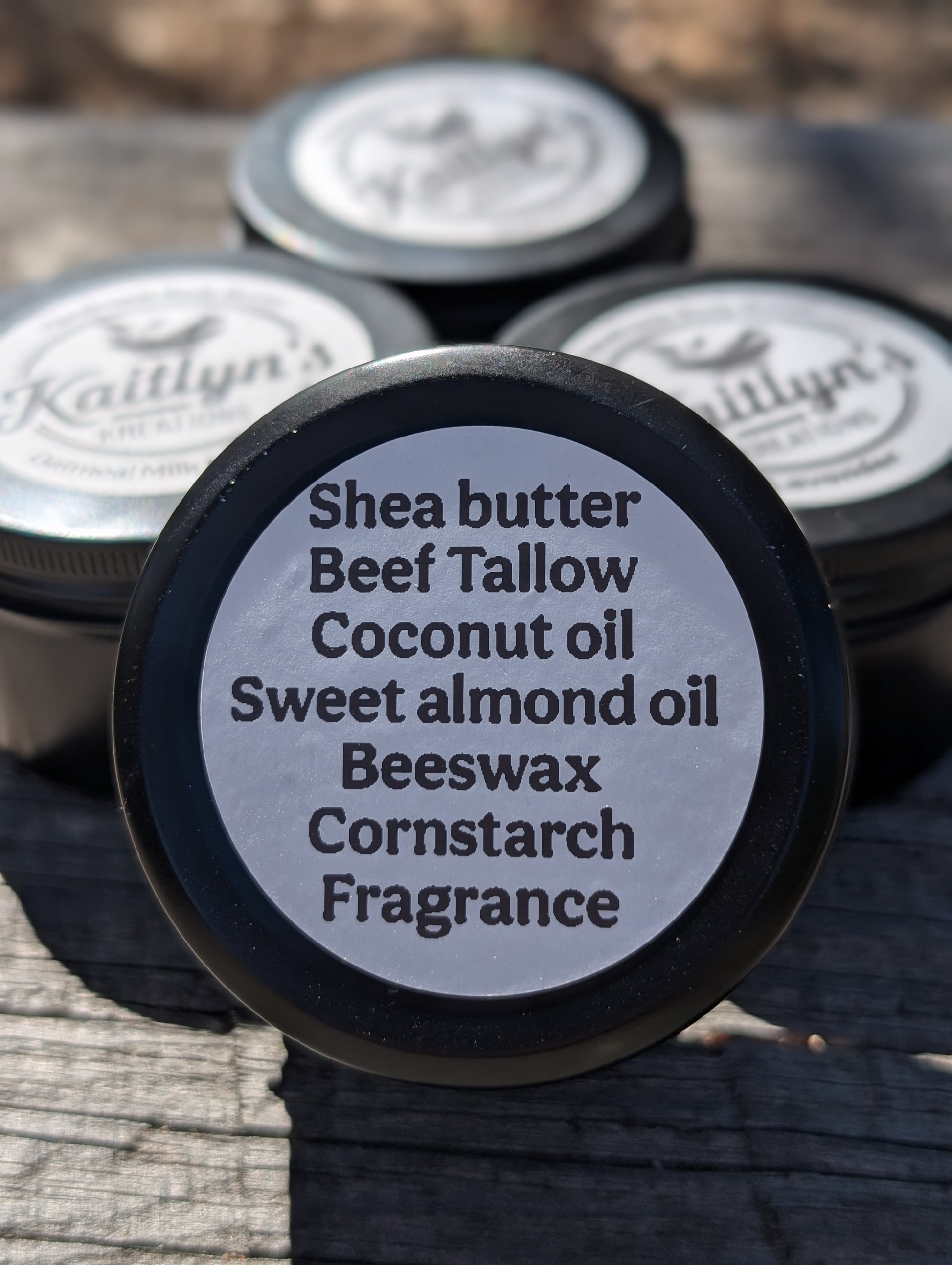 Ingredients: Organic Shea Butter, Beef Tallow, Coconut Oil, Sweet Almond Oil, Beeswax, Cornstarch, Fragrance
